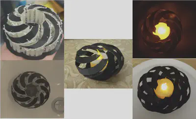 This shape was generated from an algorithm that starts with a vector sum of angles that is used to generate a spiral ribbing pattern. From this, I obtain the vertices, plot faces on them, and then generate a 3D shape on these faces to create the structure. From there all that is left is the base and cutting out a hole through the top to make room for the tea light.